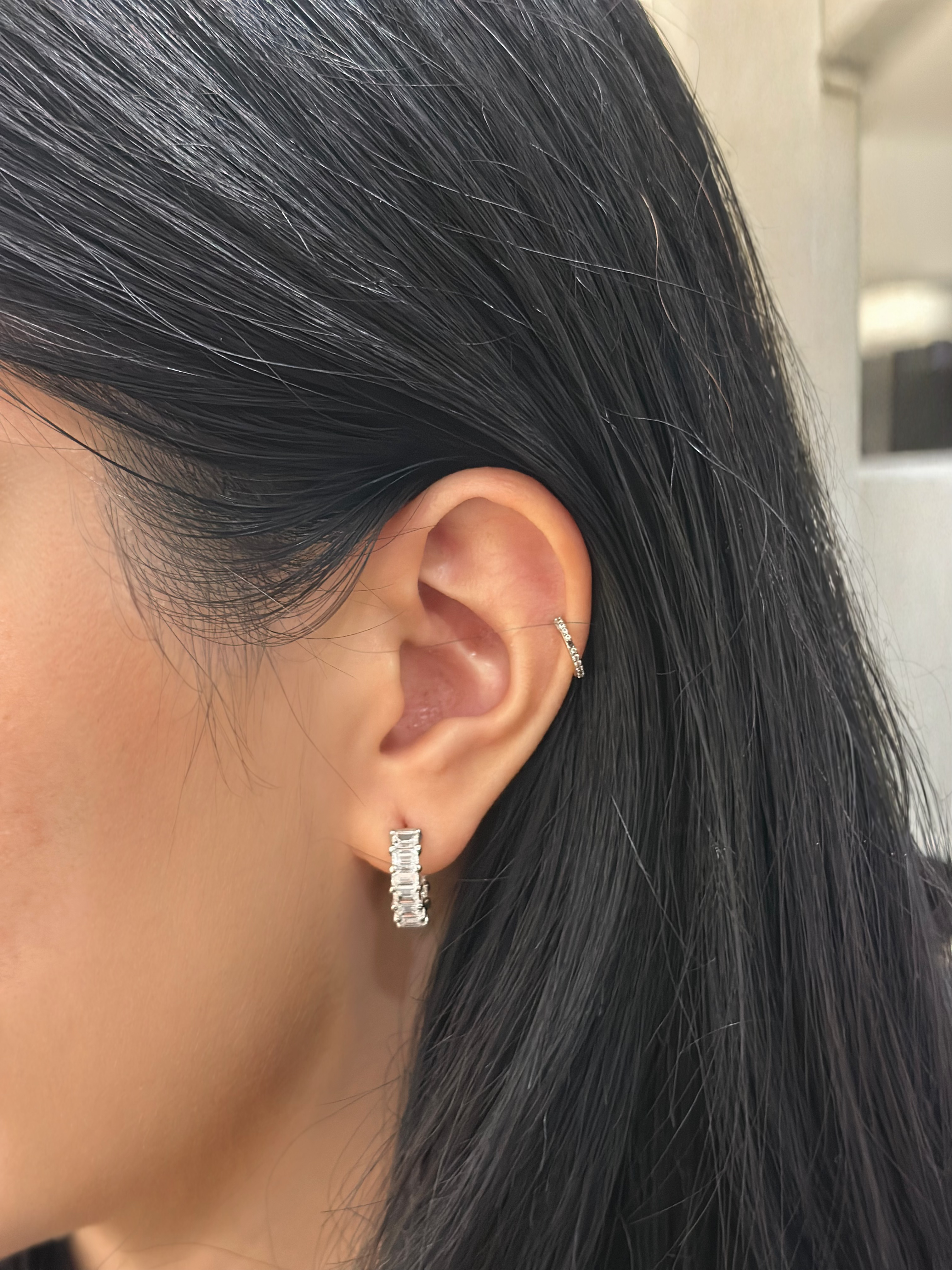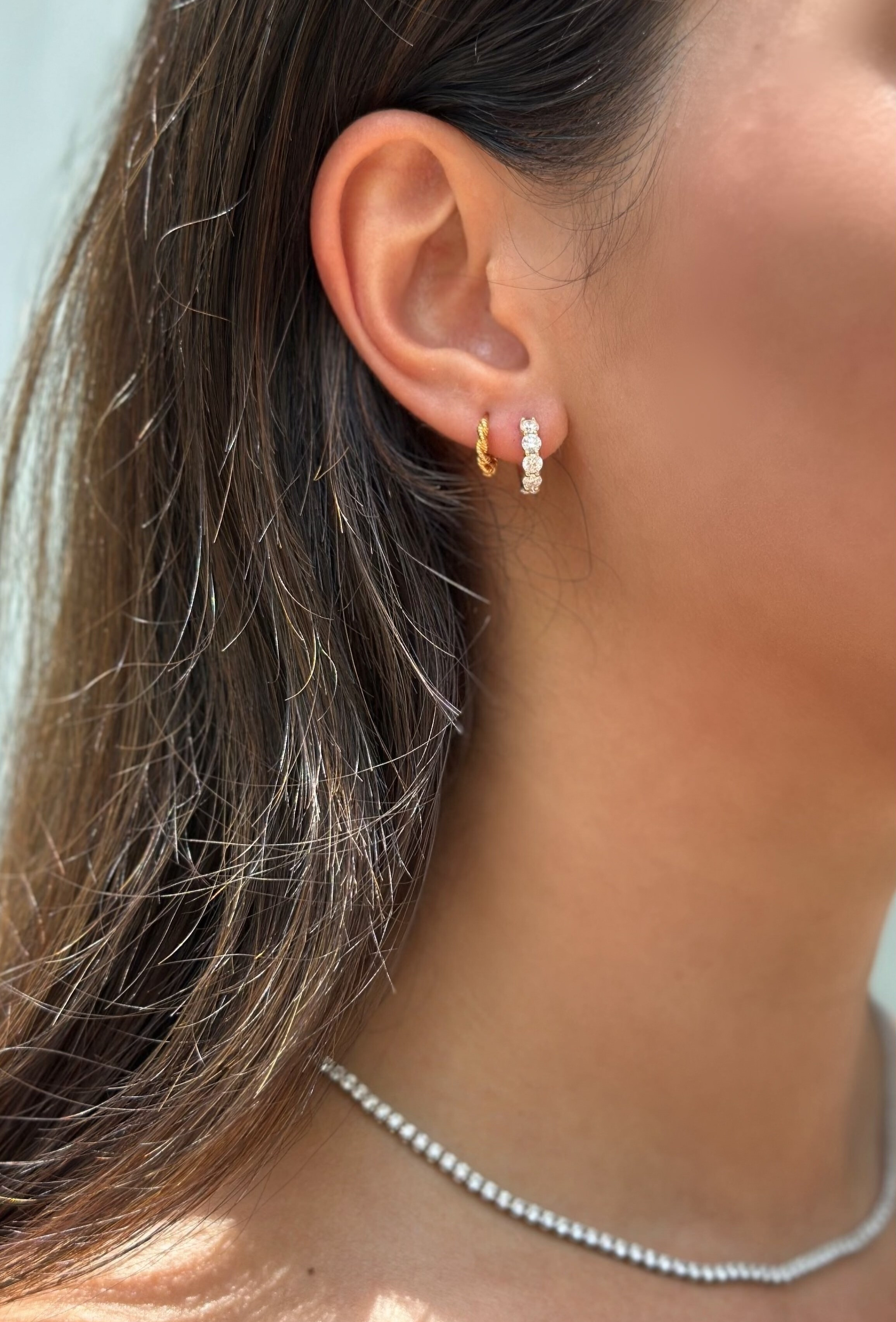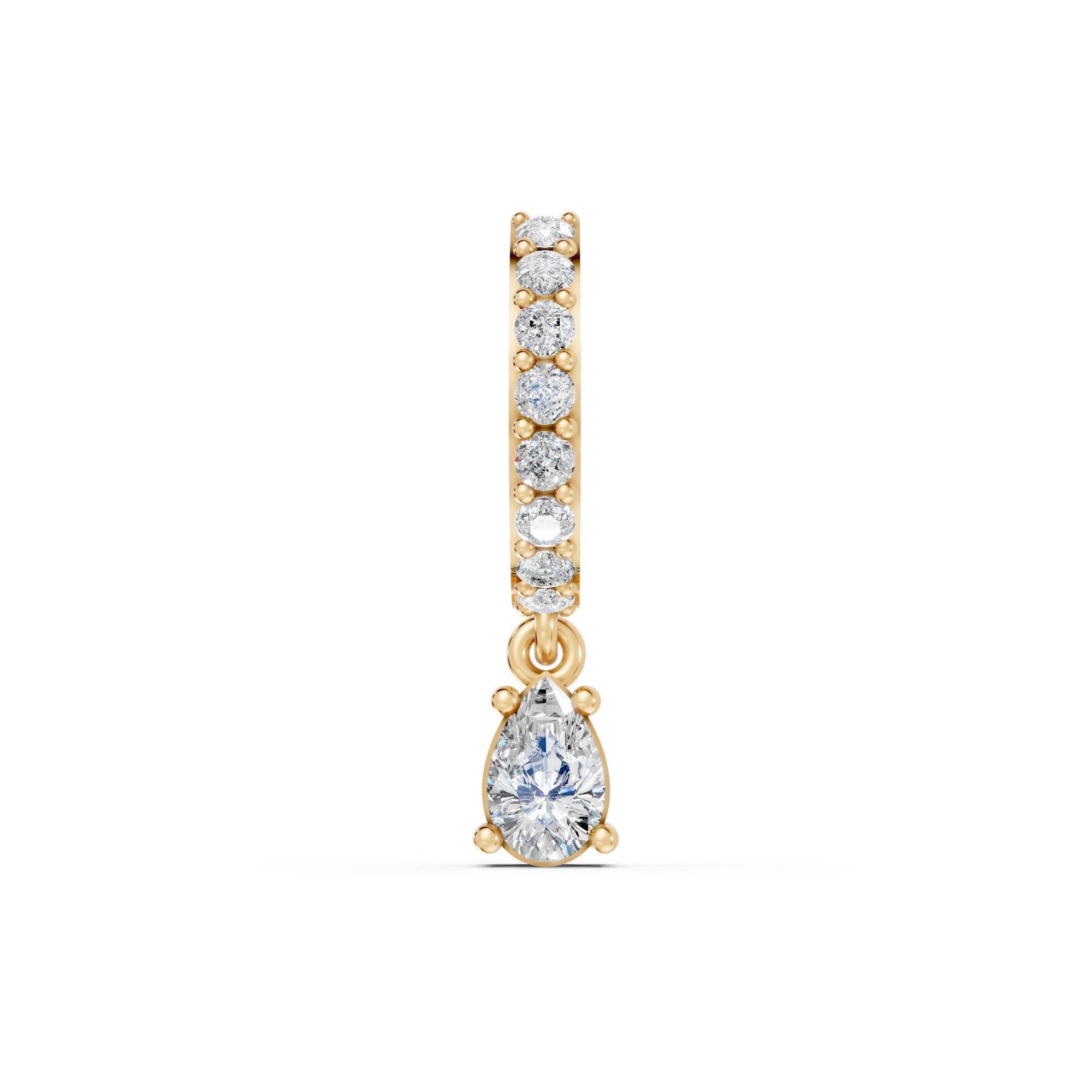 A bold yet feminine take on classic diamond studs, the Tina Earrings feature a pair of pear-cut center stones cradled by a graceful arc of pavé-set diamonds. The sculptural silhouette gives the illusion of diamonds floating along your ear, while the asymmetrical curve adds a modern twist to a timeless shape. Perfect for both everyday elegance and statement layering.