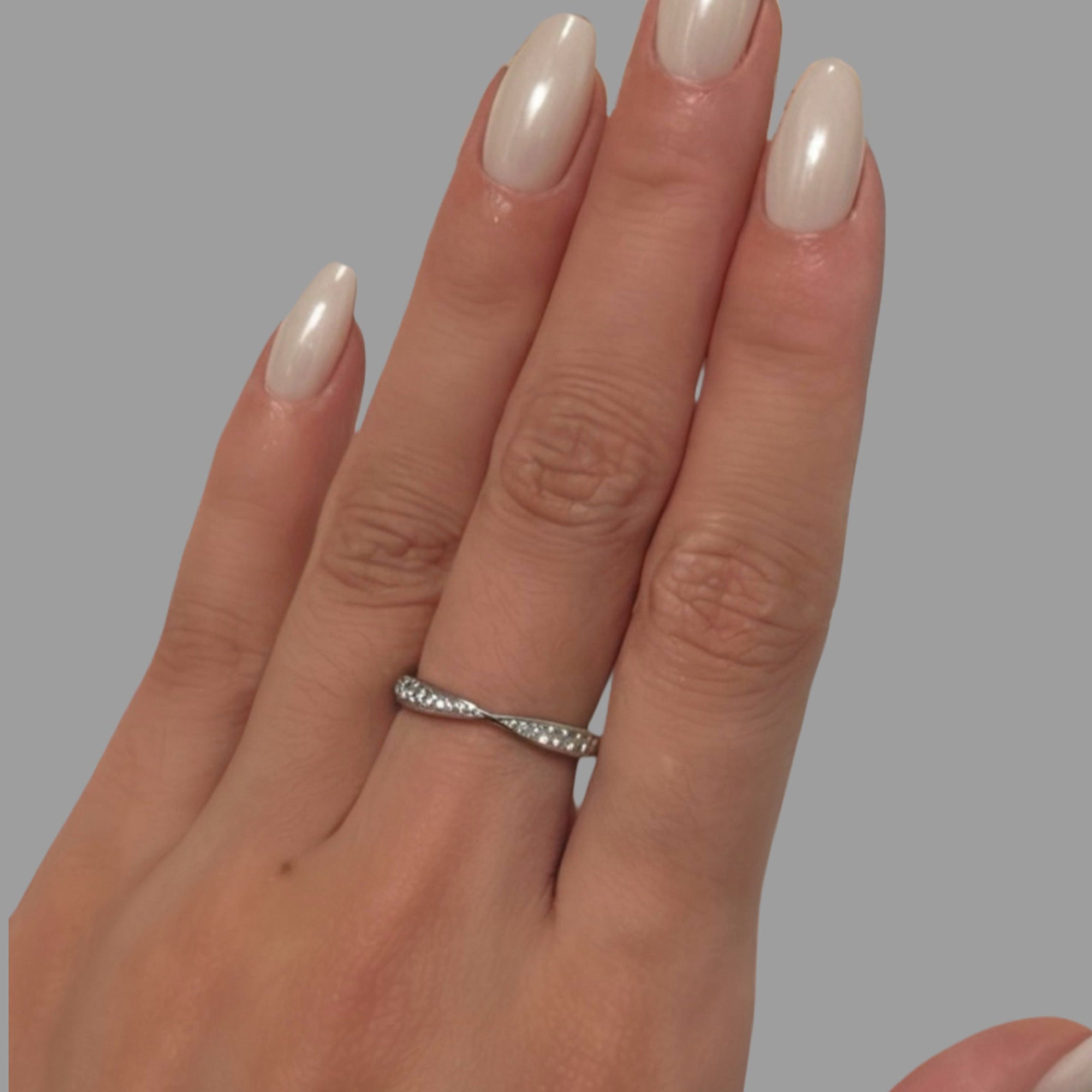 Crafted in 950 Platinum and set with round pavé diamonds, the Aurora Ring offers a modern twist, literally. Its tapered silhouette curves with quiet fluidity, designed to pair effortlessly with an engagement ring or stand alone. A softly sculpted essential for every day.
