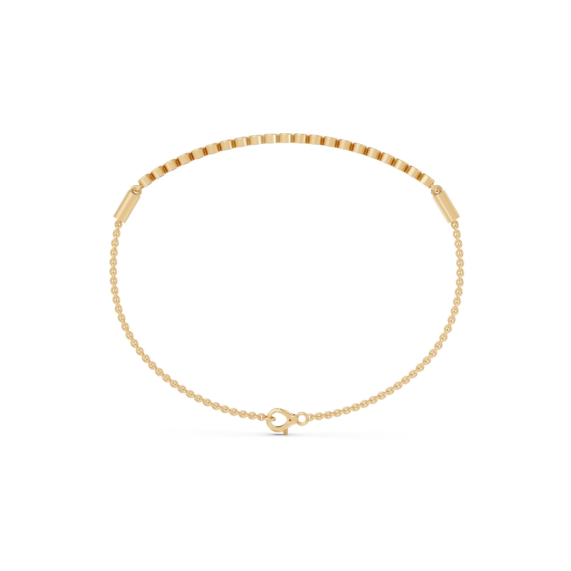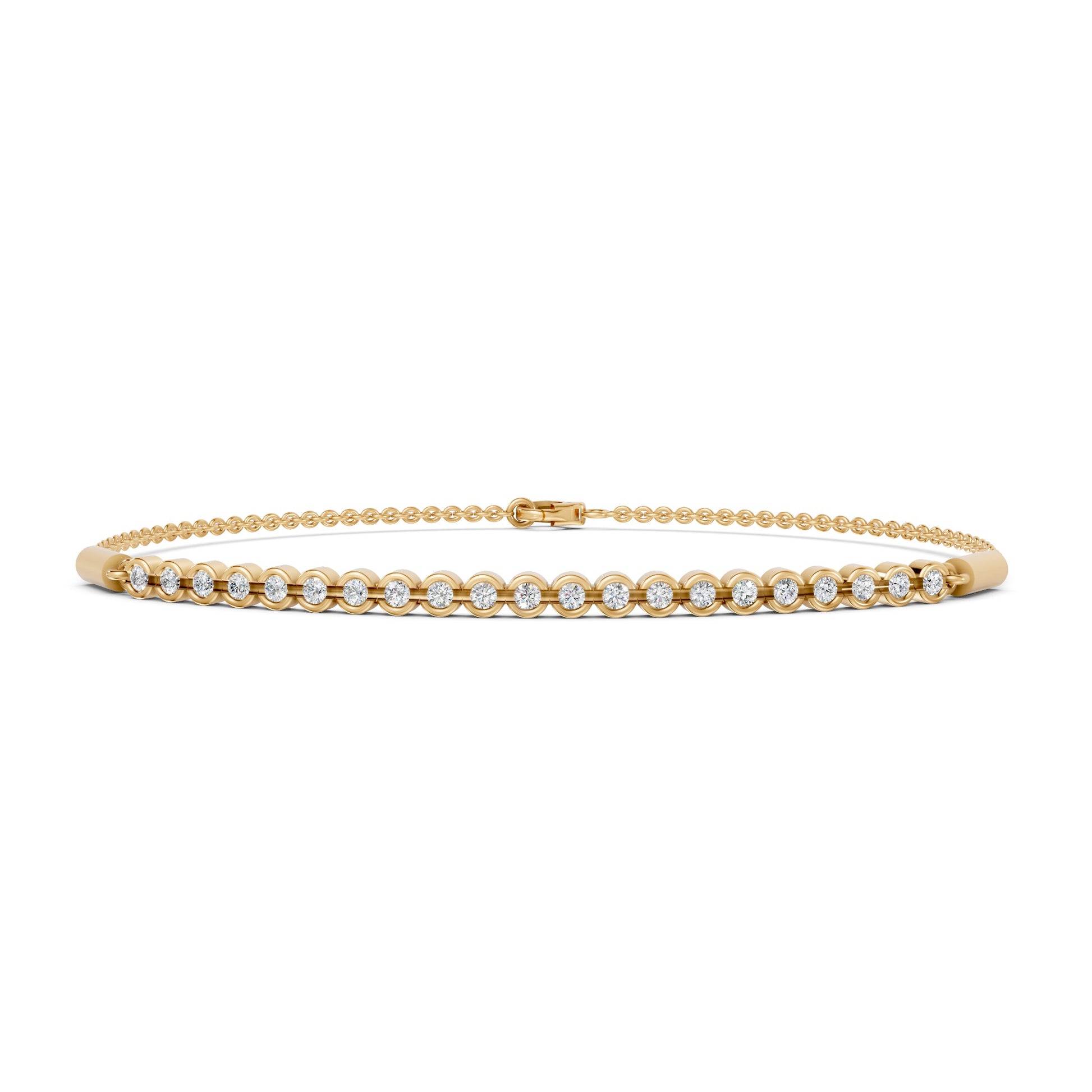 A refined take on everyday sparkle. The Regina Half Tennis Bracelet features a sleek row of bezel-set brilliant cut diamonds, paired with a delicate gold chain. Designed to move with you, it adds an effortless touch of light to any look - perfect worn solo or layered into your stack.