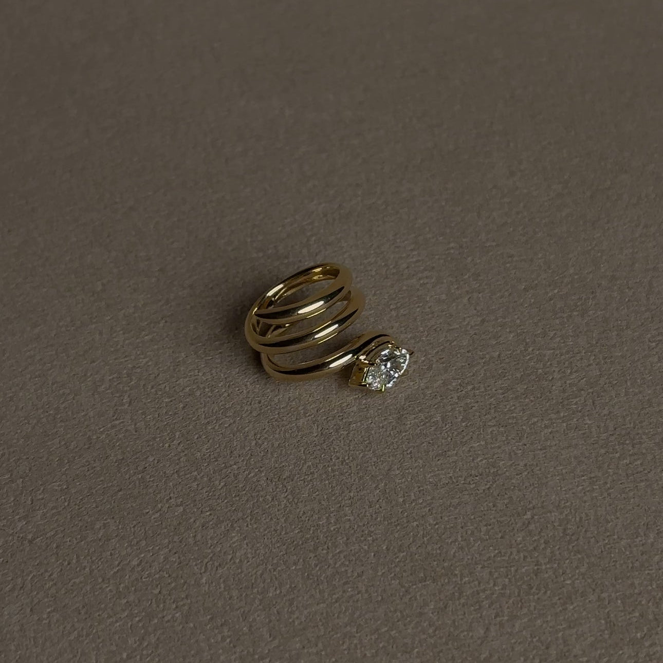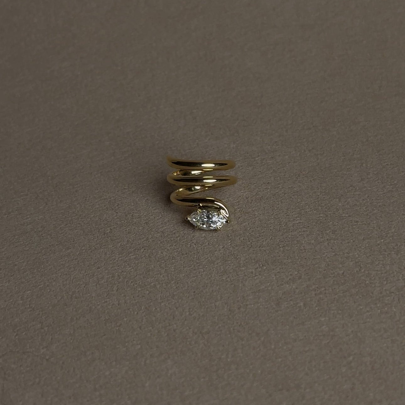 A sculptural twist on a solitaire, the Sara Ring is a bold, modern statement. Featuring a sweeping spiral band in solid gold and a brilliant marquise-cut diamond set in an elevated white gold setting, this ring is both architectural and effortlessly elegant. The open coil wraps gracefully around the finger, creating a dramatic silhouette with fluid movement.