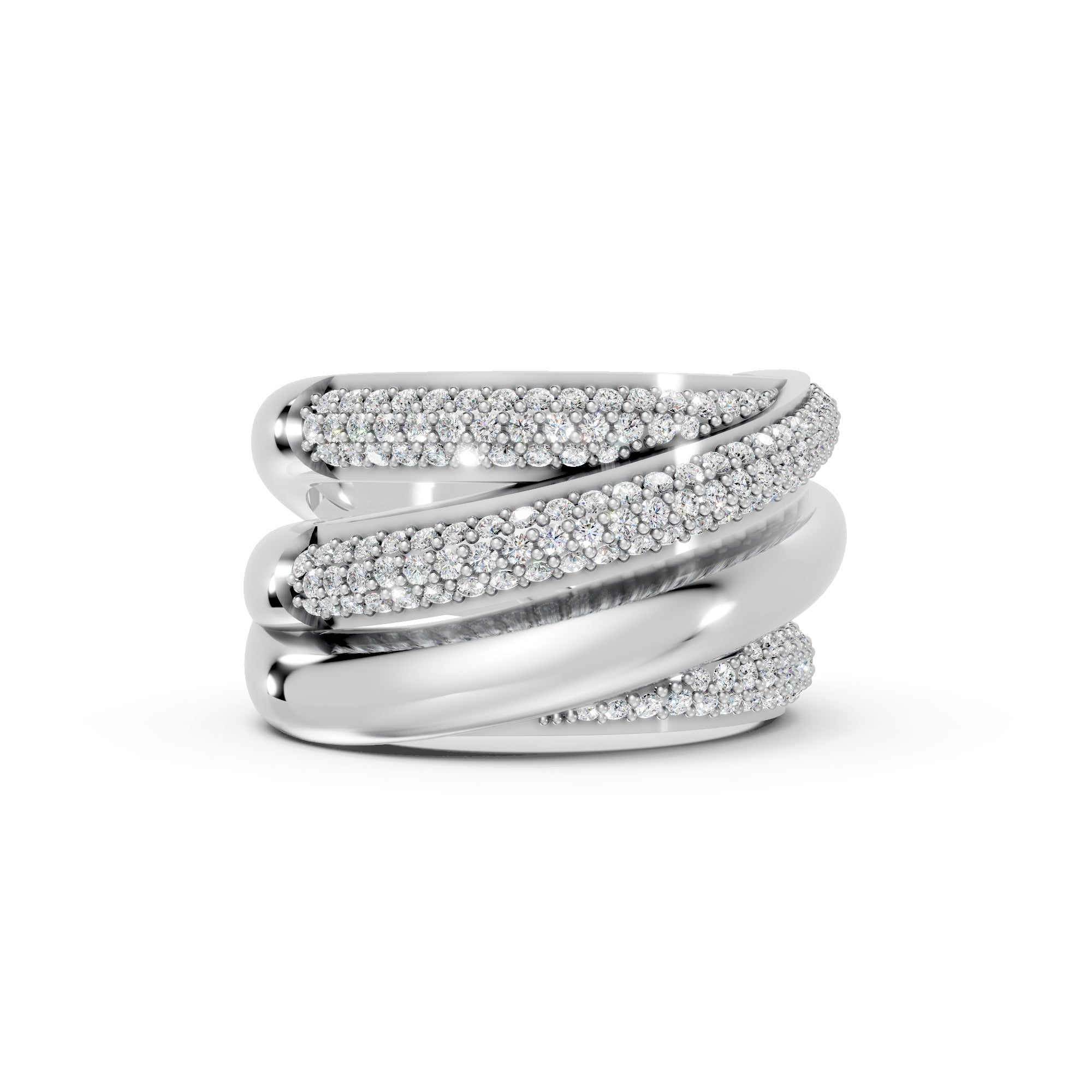 The Tessa Ring features four bold, gold bands that curve and sweep across the finger in an elegant, asymmetrical silhouette. Set with rows of over 160 micro-pavé round brilliant diamonds, it offers maximum sparkle from every angle while maintaining a graceful, wearable balance.